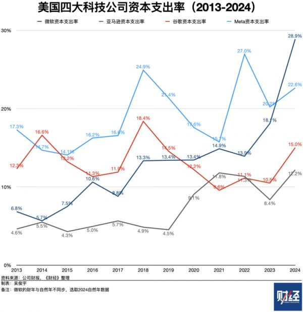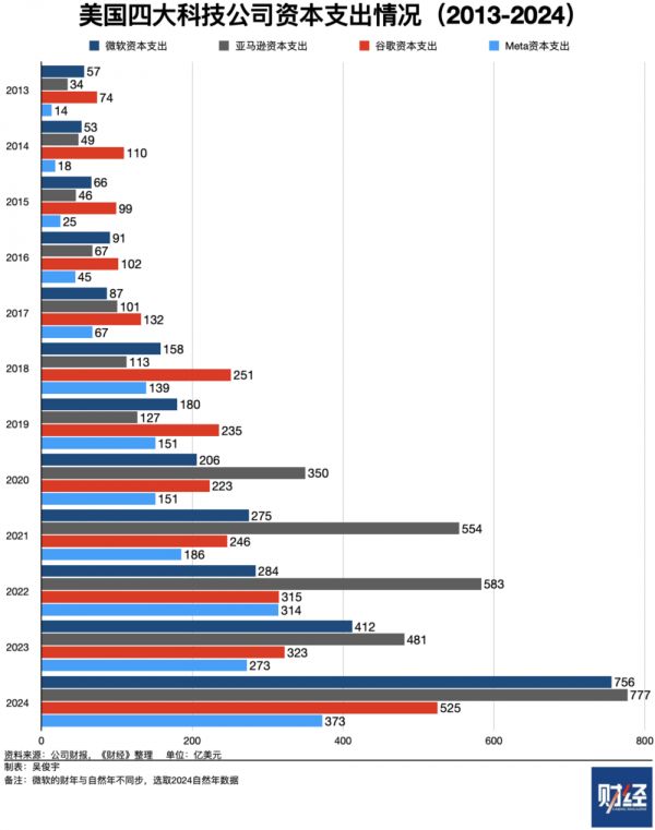 《财经》统计了微软、亚马逊、谷歌、Meta这四家美国科技公司近20年(为便于观看,图表仅显示2013年后数据)资本支出情况。2024年,这四家公司资本支出均达到历史最高峰。