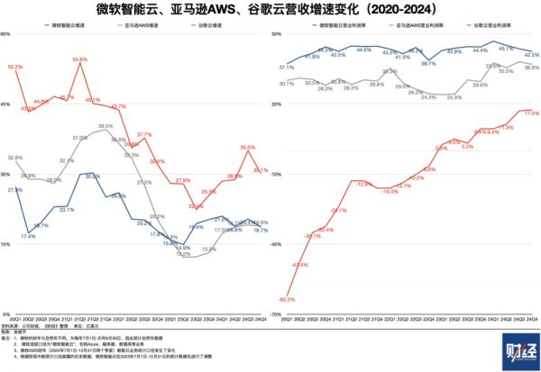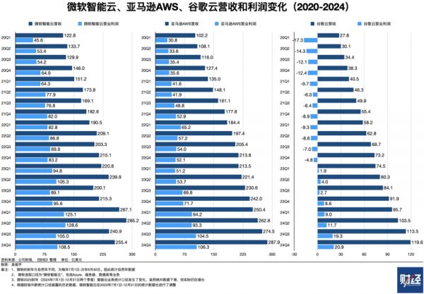 微软管理层披露,其算力支出是市场需求推动的。截至2024年四季度,微软AI业务年化收入超过130亿美元(年化收入是云公司统计口径,指当季收入的4倍。云公司客户通常按年/季/月订阅,履约收入稳定。因此该统计方式被广泛接受),同比增长175%。《财经》统计发现,微软智能云2024年营收1054亿美元,其AI业务在云业务收入中占比为12.3%。也就是说,短短两年微软的AI相关业务已初具规模。