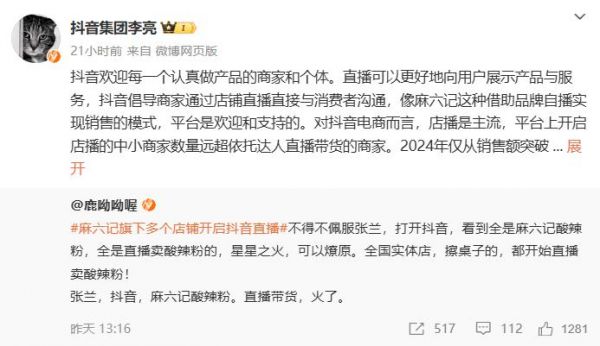 2月10日下午,抖音集团李亮发微博回应了麻六记门店直播一事。他表示抖音欢迎像麻六记这种借助品牌自播实现销售的模式,倡导商家通过店铺直播与消费者沟通。