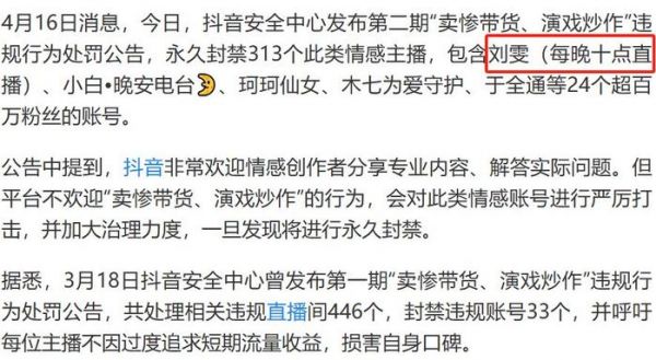 这些顶过她、为她消费的粉丝里,恐怕很少有人知道的一段往事是——2021年,抖音“永久封禁”了313个演戏炒作的情感主播账号,其中排在第一位的就是刘雯。她被封禁的理由是,“卖惨带货、演戏炒作”。