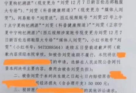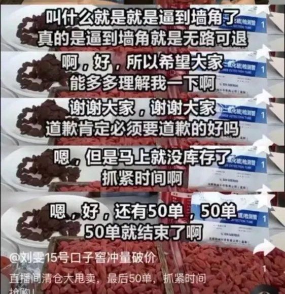 在刘雯的道歉视频和直播里,她说她要赔偿50万,道歉30天(与判决不符),刘雯说她已经“无路可退”了,然后又贴心地提醒大家“等我贵州刺梨/口子窖的直播做完”,“马上就没库存了,还有50单就结束了”。