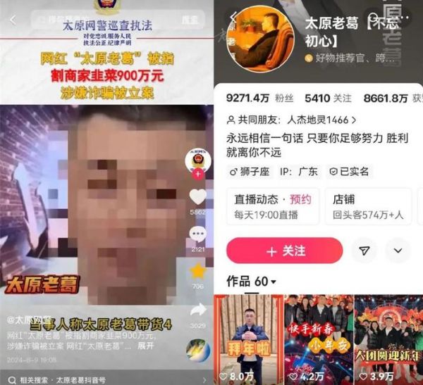2024年8月9日,抖音号“太原网警”曾发布视频证实,6000万粉丝的快手网红“太原老葛”,被指刷单割商家韭菜900万,涉嫌诈骗被立案。