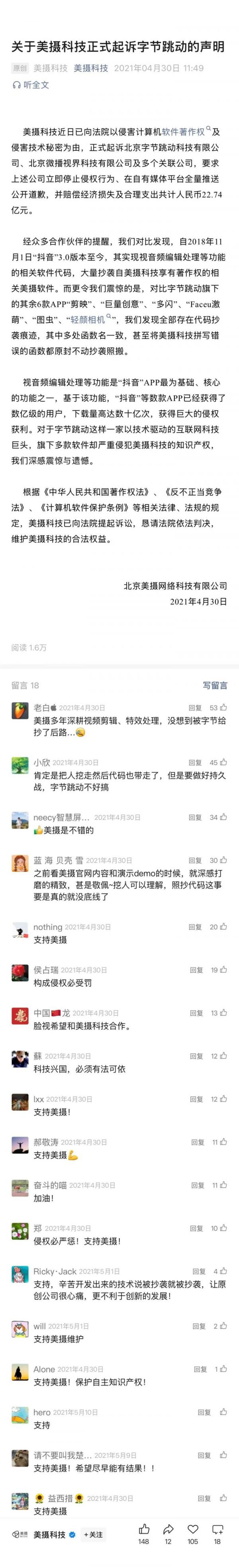 2021 年 5 月,美摄科技发布文章称,已向法院以侵害计算机软件著作权及侵害技术秘密为由,正式起诉北京字节跳动科技有限公司、北京微播视界科技有限公司及多个关联公司,要求上述公司立即停止侵权行为、在自有媒体平台全量推送公开道歉,并赔偿经济损失及合理支出共计人民币 22.74 亿元。