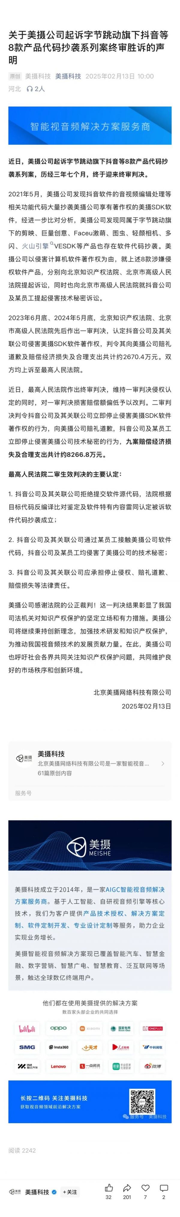 2025 年 2 月 13 日,美摄科技发布《关于美摄公司起诉字节跳动旗下抖音等 8 款产品代码抄袭系列案终审胜诉的声明》。