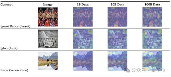 从结果来看,1B数据集训练的模型在注意力图上无法很好捕捉细节。10B数据集有所改善,100B数据集能更精准。