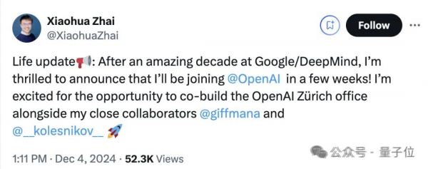 作者之列中还发现了ViT核心作者翟晓华。2024年12月,他在推特上官宣,将入职OpenAI苏黎世实验室。