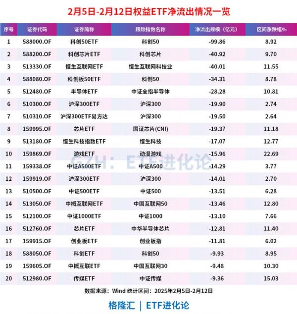 下图的科创50ETF、科创芯片ETF、恒生互联网ETF、科创板50ETF和半导体ETF等20只ETF在2月5日-2月13日合计净流出规模为456.96亿元。