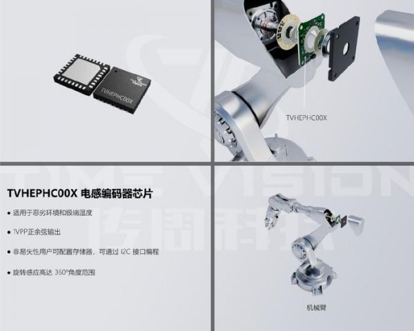 TVHECHL00X全集成式电感编码器芯片,利用亚微米级CMOS工艺技术,实现片上集成复杂的高精度电感编码器线圈。该款产品进一步提高系统的整体性能和可靠性,为小型化且对精度要求严苛的设备提供技术支撑。通过嵌入式自校准技术实现动态误差补偿,在复杂电磁工况下仍保持稳定的位置感知能力。可应用于高速运动控制、机械电子、工业自动化等领域,特别适用于多轴机械臂关节姿态反馈、数控机床主轴闭环控制以及协作机器人柔性驱动系统。