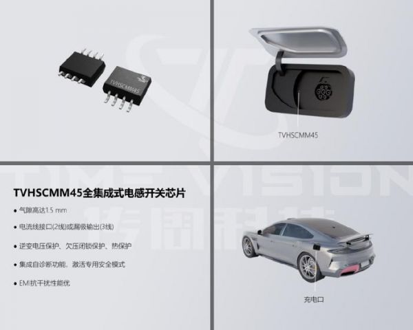 TVHSCMM45全集成式电感开关芯片,采用亚微米级CMOS工艺技术,实现片上集成电感线圈,通过将发射线圈与接收线圈的片上集成,大幅度缩减系统尺寸。全自研高可靠性芯片架构保障系统即便在新能源车高压电枢等严苛场景下,仍可保持毫米级检测稳定性。可以广泛应用于汽车安全控制系统、动态总成监测、智能座舱,包括充电口盖、安全带扣、座椅定位、门锁和把手等场景。