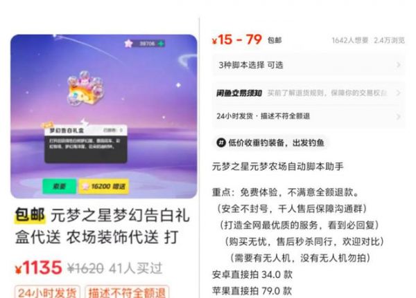 农场游戏已成为了不少人的财富密码。在闲鱼、淘宝和拼多多等平台内,搜索《元梦之星》、《蛋仔派对》等带有农场的关键词,就会看到由个人和工作室提供的脚本服务、代练、代充、代送皮肤等各式各样的付费服务,吸引不少玩家购买。
