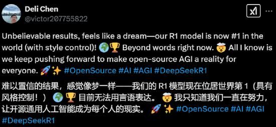 当DeepSeek-R1登上大模型竞技场(开启风格控制)榜首时,DeepSeek员工Deli Chan发文感叹:“难以置信的结果,感觉像梦一样——我们的R1模型现在位居世界第一(并开启了风格控制)。我的激动之情难以言表,我只知道我们一直在努力,让开源通用人工智能成为每个人的现实。