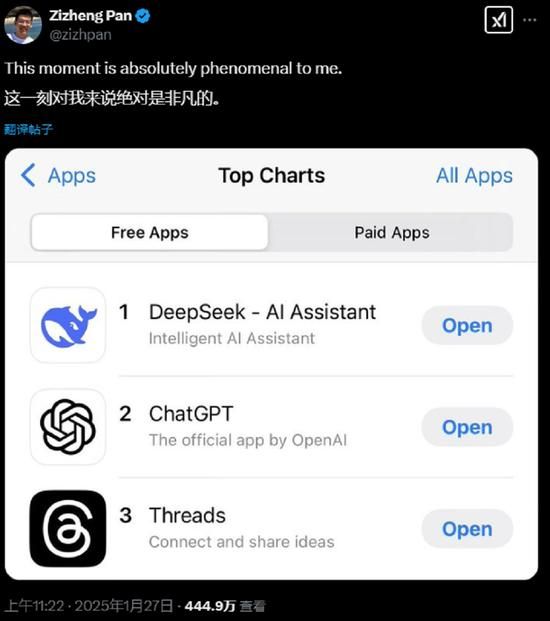 当DeepSeek登顶App Store后,他在X平台感叹道:“这一刻对我来说绝对是非凡的。”