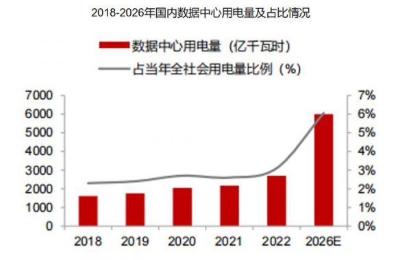 根据数据,预计2026年我国数据中心用电量有望超过6000亿千瓦时,其用电量占比将从2016年的1.86%迅猛增长至2026年的6%。