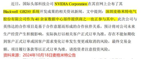 2024年10月18日,麦格米特发布公告称,公司作为英伟达指定的数据中心部件供应商之一,正参与其Blackwell GB200系统的建设。