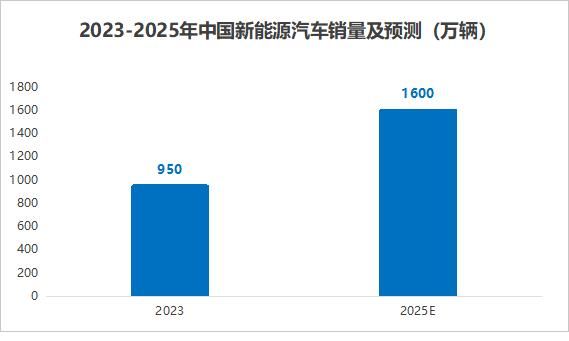根据数据,预计2023到2025年中国新能源汽车销量将从950万辆飙升到1600万辆,同时渗透率也将从32%提高到57%。