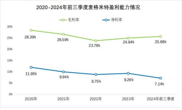 2020到2024年前三季度,麦格米特毛利率较为稳定,始终保持在20%以上。但是,公司净利率从2020年的11.95%下降到2024年前三季度的7.14%,盈利能力被大幅削弱。
