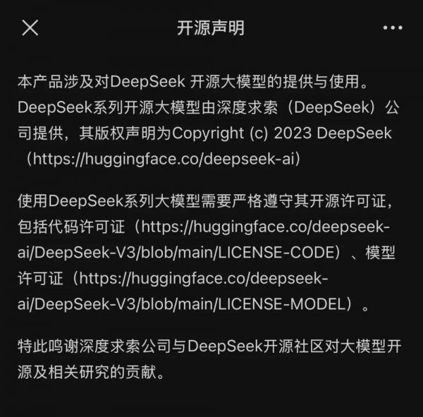 从功能附带的开源与鸣谢声明中能看出,微信中内置的DeepSeek R1基于开源版本构建,但并未明确提及其使用的模型体积,是否是671B的“满血”R1版本。