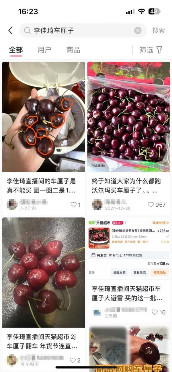 图源:小红书截图春节正值车厘子的时节,很多人都选择车厘子作为年货佳品。李佳琦直播间也在卖车厘子,却卖“翻车”了。有多位消费者在网上说,在李佳琦直播间购买的车厘子,存在严重质量问题,烂果、发霉都有。直播间里面宣传的,都是“标准3J新鲜甜美”啊。