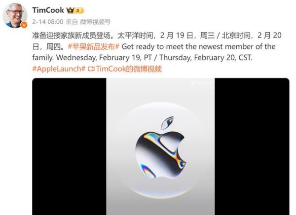 值得一提的是,同天还有另外一家厂商凑热闹,库克宣布2月19日推出新品,北京时间正好赶上2月20日凌晨。虽然库克没介绍新品信息,但外界普遍猜测为iPhone SE 4,还在介绍中写到“准备好迎接家庭新成员吧”,必然是重磅新品。