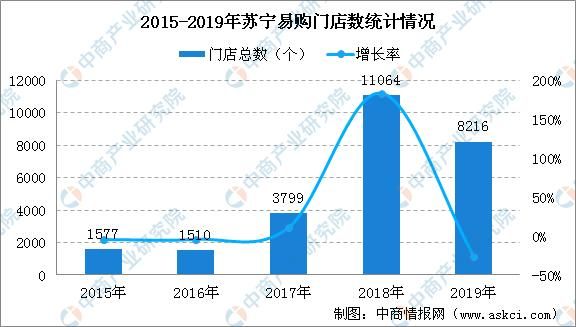 苏宁的门店数量在2017年和2018年开始以接近300%的增幅往上涨。