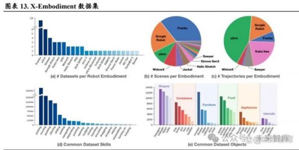 大模型具备较强泛化性,仿真数据有望大范围应用。谷歌 RT 采用该种技术路径。谷歌在 RT-1 和 RT-2 的框架上使用 X-Embodiment 数据集进行训练,该数据集包含在 22 个机器人上采集的能够完成 16 万个任务的上百万条数据。其中,RT-1 充当小脑层级的控制器,由大模型负责顶层理解和指令分 解,例如打开抽屉、将物体从抽屉里拿出来等。 RT-2 采取端到端路径,将语言、动作 tokens 进行 对齐,微调后得到 VLA 模型,使得模型能够通过视觉输入和语言指令生成正确的动作标记序列。大 模型使机器人从 Model-Based 向 Learning-Based 转变,在解决复杂和高维度的运动控制问题上具备 更高的上限。但是大模型的训练需要海量数据,按数据来源分类,可分为真实数据和仿真数据。真 实数据效果最好,但需要耗费大量人力和硬件成本。仿真数据成本低,可以大规模获取,但通常存 在 sim-to-real gap。