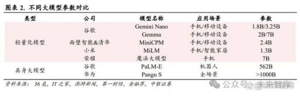 小型端侧设备无法消化大模型大算力,具身智能有望成为智能体最佳载体。2023 年,GPT-4 Turbo 发布,其参数量高达 1.8 万亿。2024 年 4 月,国内商汤科技“日日新”大模型体系正式发布,其中 中文语言大模型参数达 1800 亿。随着大模型参数量的大幅增长,传统穿戴设备、手机等无法消化大 模型大算力。从目前市场上的端侧大模型来看,通常设备端越大(功能越多),其端侧大模型的参 数量也越大。例如,面壁智能联合清华 NLP 实验室发布的开源端侧大模型面壁 MiniCPM 参数规模 为 20 亿;小米手机大模型参数达 13 亿;荣耀端侧平台级 AI 大模型参数规模 70 亿。而具身智能需 要处理更复杂的任务,如环境感知、运动控制、决策制定等,其算法和模型需要快速处理大量数据 并做出决策,因此具身智能需要更大的模型参数来支持其更广泛的功能和更高的智能需求。谷歌开 发的 PaLM-E 具身多模态大模型参数量达 5620 亿;华为盘古 Pangu S 大模型参数达万亿。相比小型 端侧设备,具身智能机器人能够消化大模型、大算力。