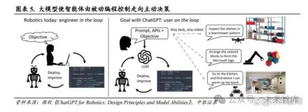 大模型使智能体由被动编程控制走向主动决策。与智能体结合后,具身智能以任务目标为导向,不 仅仅是机械地完成程序,其可以根据环境变化,对行动细节进行实时修正,并消除在特定条件下为 特定任务反复编程的需要。依托大模型的涌现能力,具身智能能够从原始训练数据中学习并发现新 的特征和模式,在仅仅依靠网络数据知识的情况下就可以对从未见过的对象或场景执行操作任务。 以微软《ChatGPT for Robotics: Design Principles and Model Abilities》为例,操控者只需准备好机器 人底层的函数库,并将任务目标告诉 ChatGPT,ChatGPT 即可自动完成代码并指挥具身智能机器人 行动。