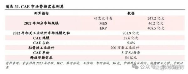 CAE 国产替代空间广阔,公司在国产厂商中具备领先优势。根据 IDC 发布的《中国设计研发类工 业软件之 CAE 市场厂商份额,2022:流水争先》和智研咨询产业研究,2022 年我国 CAE 市场规模 为 37.6 亿元,国产化率为 16.2%。公司 2022 年营业收入达 2.68 亿元,对应市场份额为 7.13%,与排 名第三的达索系统市场份额接近,公司在国产厂商中具备领先优势。 国产替代浪潮至,国产替代需求有望超 50 亿元。近日,工信部发布《工业重点行业领域设备更新和 技术改造指南》,提出重点更新计算机辅助设计(CAD)、计算机辅助工程(CAE)、计算机辅助 制造(CAM)、制造执行系统(MES)、企业资源计划(ERP)等研发设计、生产制造、经营管理、 运营维护相关软件。到 2027 年,完成约 200 万套工业软件和 80 万台套工业操作系统更新换代任务。 根据赛迪发布的《数说 IT》和 IDC 发布的《中国设计研发类工业软件之 CAE 市场厂商份额,2022: 流水争先》,2022 年研发设计类软件(包括 CAD、CAE 等)市场规模为 247.2 亿元,其中 CAE 市 场规模为 37.6 亿元人民币,根据 IDC 和智研咨询的《IDC 中国制造业 MES 市场分析及厂商份额, 2022:行业为王》和《2024-2030 年中国 ERP 软件行业市场研究分析及投资前景评估报告》,2022 年中国 MES、ERP 市场规模分别为 46.2 、408.5 亿元。假设工业软件替换比例与 CAE 市场规模占 比一致,目前市场上一套 CAE 软件价格从万元到百万元不等,按 5 万元保守测算,释放的替换需求 有望超 50 亿元。