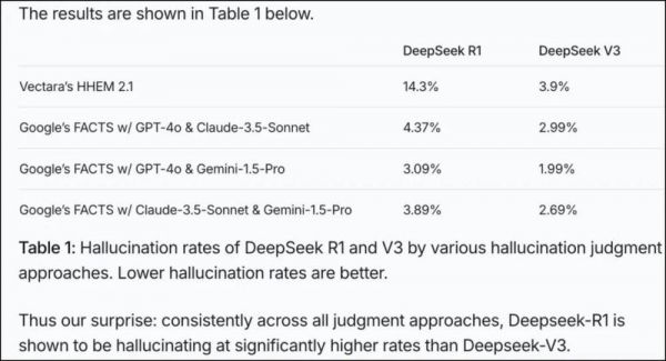 在Vectara HHEM的人工智能幻觉测试中,DeepSeek R1的幻觉率达到14.3%;