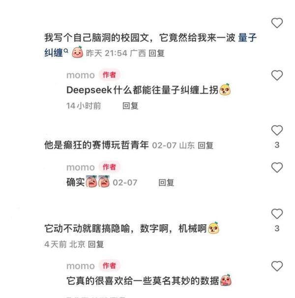 有网友分享自己在创作“梦女文”时,DeepSeek时常夹带“私货”,融入科幻元素,虽剧情走向符合期待,给人的观感却不伦不类,似乎下一秒就要“赛博飞升”。在满足用户对此类文章情感需求时,内容的文学性和连贯性则跌下一个维度。