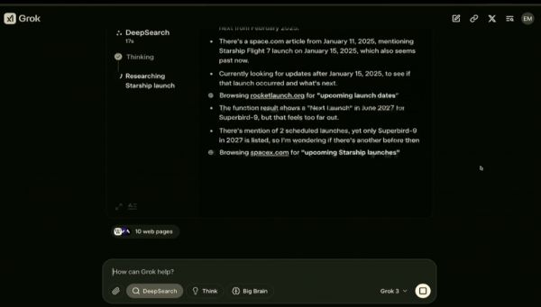 基于 Grok3 推理模型,Grok app 上线了 DeepSearch 功能,DeepSearch 可以表达其理解查询的过程以及计划响应的方式,会扫描互联网和 X,分析信息,并针对问题提供摘要。据现场演示,DeepSearch 包括研究、头脑风暴和数据分析等选项。