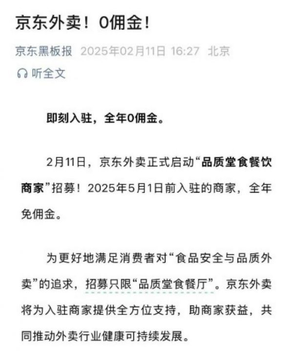 2月11日下午,京东在其官方公众号“京东黑板报”上发文,宣布京东外卖正式启动“品质堂食餐饮商家”的招募,并表示:凡是在2025年5月1日之前入驻的商家,将能够享受全年免佣金的政策。