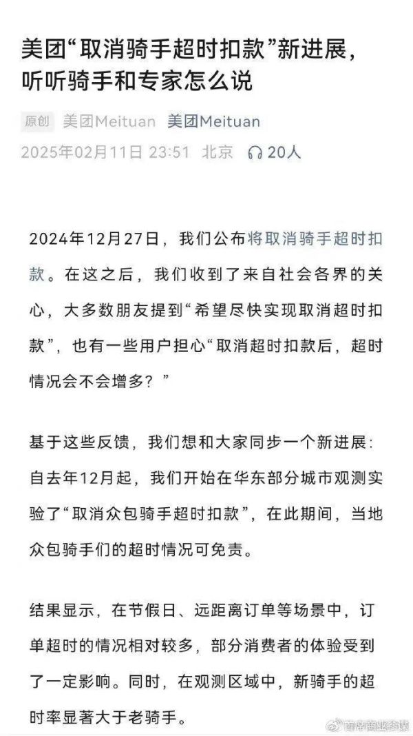 2月14日,美团又宣布本周将正式在广西部分城市首次上线“超时免罚”试点。在试点区域将全面取消超时扣款,将众包骑手的“超时扣款”改为积分制度,并辅以支持策略,如培训帮扶新骑手、优化出餐调度和申诉通道,持续改善骑手的配送体验。