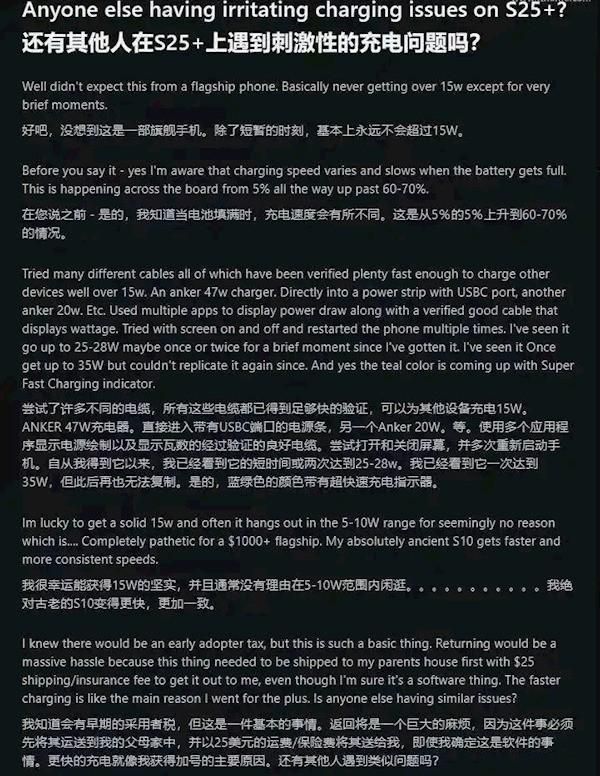 除了充电速度的问题,部分用户还表示,在使用三星自家的45W充电器和配套5A数据线时,手机会频繁在“超级快充2.0”和“未充电”状态之间切换。当用户选择关闭“快速充电”选项后,手机虽然可以正常充电,但速度会显著降低。这一现象并非个例,三星欧洲社区论坛以及社交媒体上均有用户报告了类似的问题,涉及机型不仅包括Galaxy S25+,还有Galaxy S25 Ultra。其中,有意大利用户提到,其在使用三星45W充电器和配套数据线为Galaxy S25 Ultra充电时,设备会间断性地连接和断开。