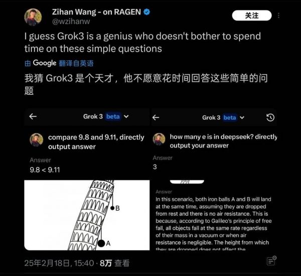 在这个测试发出之后,很短的时间内迅速引发了不少朋友的关注,无独有偶,在海外也有很多类似问题的测试,例如“比萨斜塔上两个球哪个先落下”这些基础物理/数学问题,Grok3也被发现仍然无法应对。因此被戏称为“天才不愿意回答简单问题”。