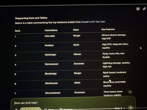 除了网友自发测试的这些基础知识上Grok3出现了翻车,在xAI发布会直播中,马斯克演示使用Grok3来分析他号称经常玩的Path of Exile 2(流放之路2)对应的职业与升华效果,但实际上Grok3给出的对应答案绝大部分都是错误的。直播中的马斯克并没有看出这个明显的问题。