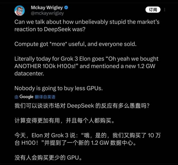 而为了这些差距,马斯克所付出的代价堪称高昂:在发布会中,马斯克用近乎炫耀的口吻表示,用了20万张H100(马斯克直播中表示使用“超过10万”张)训练Grok3,总训练小时数达到两亿小时。这让一部分人觉得这是对GPU行业的又一个重大利好,并认为DeepSeek给行业带来的震动是“愚蠢”的。