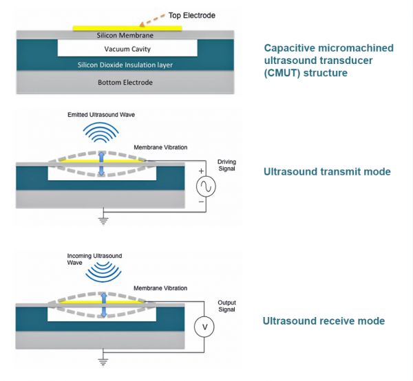 与依靠材料本身变形的传统压电体材料不同,CMUT通过微加工半导体膜片的偏转来传输和检测超声波。其在尺寸、分辨率以及功耗表现上远超传统压电,也正因此,使得CMUT跟PMUT得以为超声波感测打开新的应用市场。