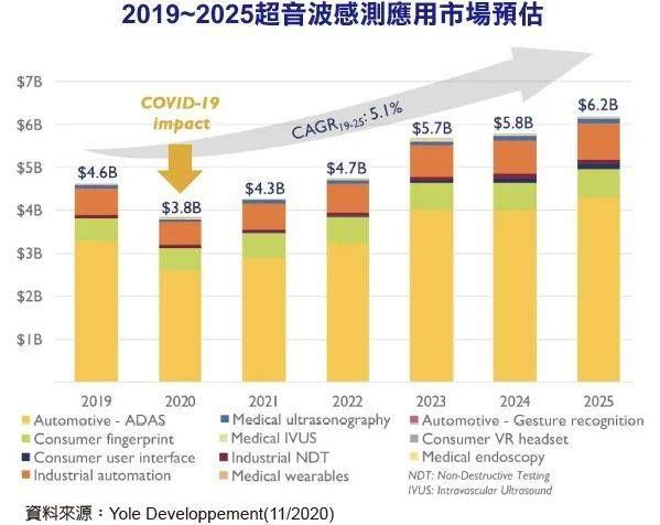如图所示,汽车是超声波市场的主要应用,另外还包括了医疗、人机交互、工业以及VR等等场景。