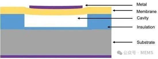 作为MUT类别的一部分,CMUT依赖于静电换能机制。CMUT的振膜包括用作顶部电极的导电层。底部电极通常由导电衬底组成。在这两者之间存在一个空腔,当在电极上施加电压时,空腔内会产生电场。振膜通常被设计为方形、圆形或六边形。该膜在其周边固支,并悬浮在空腔上方。空腔可以是真空的或充气的,通常具有每微米数十伏特或更高的电场,从而导致高机电耦合系数。为了防止电极之间的任何接触以及由此产生的短路,还需要添加绝缘层。普通的CMUT横截面的示意图如下图所示。