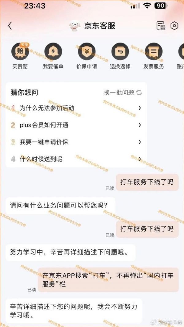 2月18日晩上11点43分,《网约车内参》通过京东在线客服询问,打车服务是否已经下线,没有获得回应。