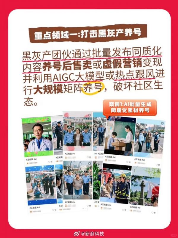 打击黑灰产养号:黑灰产团伙先通过常见手段养号,如批量发布同质化影视综二创视频,把号养到高粉;随后,黑灰产团伙通过售卖账号或发布虚假营销内容进行变现。过去三个月,治理团队共处置黑灰产养号超过 100 万个。近期,真人养号因其隐蔽性成为当前治理重点,黑灰产团伙利用 AIGC 大模型批量生成同质化素材,或采取热点跟风手段,通过超大规模矩阵养号,严重扰乱社区生态。