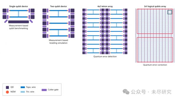 这张图展示了一个基于拓扑量子比特的器件架构从简单到复杂、从单比特到多比特、再到可进行量子纠错的完整演进路线。