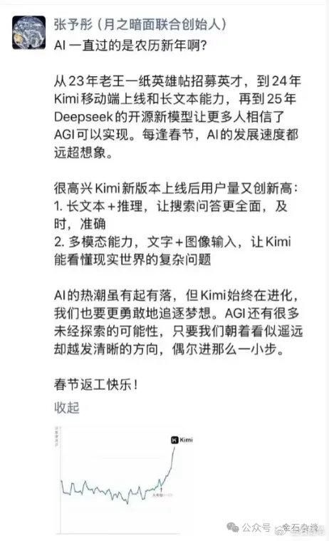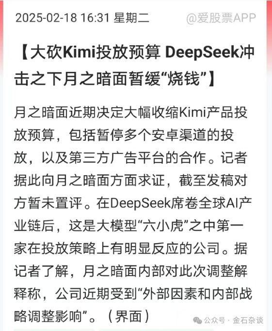 突然想到前几日张予彤给kimi打广告,当时金石分析或是源自deepseek的危机意识,如今看来或对kimi等大模型融资和推广带来强烈冲击,影响不容小觑。不知几十亿美元的融资最终能否成功退出?
