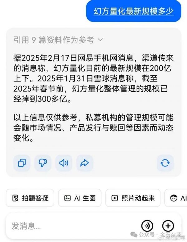 2)就在2月19日下午,金石杂谈看到一张截图,可以说真的被震惊到了,那就是有消息称幻方目前规模极度缩水,已经降到100多亿了。600多亿的量化巨头,只剩下100多亿?这消息让人有点猝不及防,难以置信。
