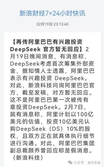 2025年2月,传闻阿里拟10亿美元认购deepseek10%股权,对应估值100亿美元。阿里虽然进行了否认,但有知情人士认为现在处于敏感时期,让子弹再飞一会。就在刚刚,阿里再传投资deepseek。