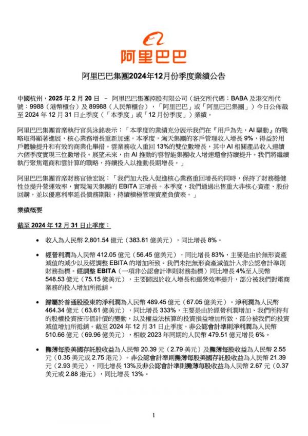 2025 年 2 月 20 日,阿里巴巴集团控股有限公司发布截至 2024 年 12 月 31 日止季度业绩。