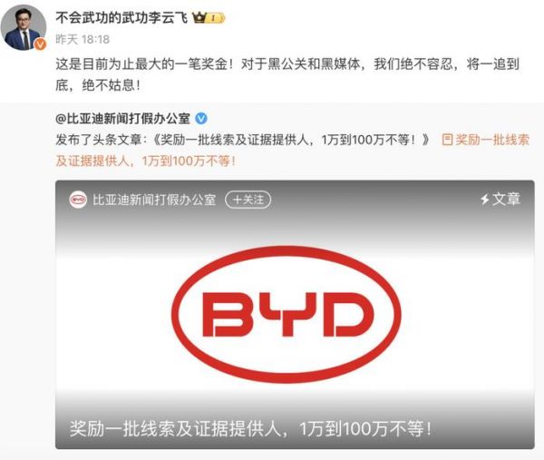 比亚迪集团品牌及公关处总经理李云飞表示:“这是目前为止最大的一笔奖金!对于黑公关和黑媒体,我们绝不容忍,将一追到底,绝不姑息!”