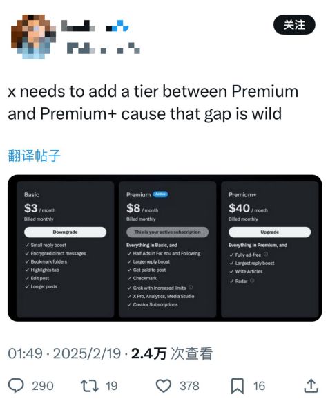 虽然没有明说,但用户普遍认为这是在为Grok 3付费,毕竟其他两档计划的订阅费用不变,因此形成了从3美元、8美元突然跃升到40美元的奇怪格局,两档订阅之间的跨越过大。