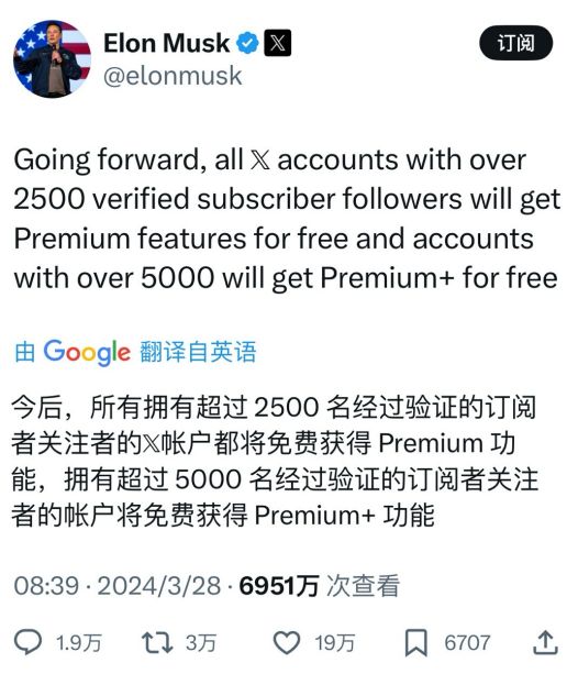 马斯克大手一挥当好人,本来就是免费用户的有福了,为信仰充值Premium+的用户成了大冤种。